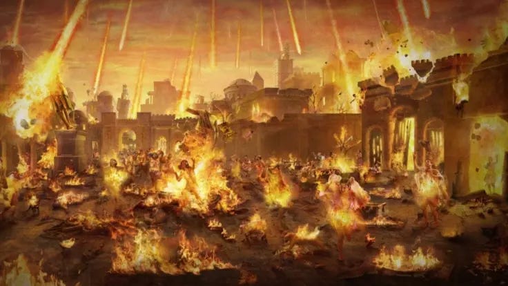 Nu foc metaforic. Nu distrugere simbolică. Foc real din cer. Anihilare totală. Patru cetăți șterse de pe hartă. Ținutul a devenit permanent toxic.